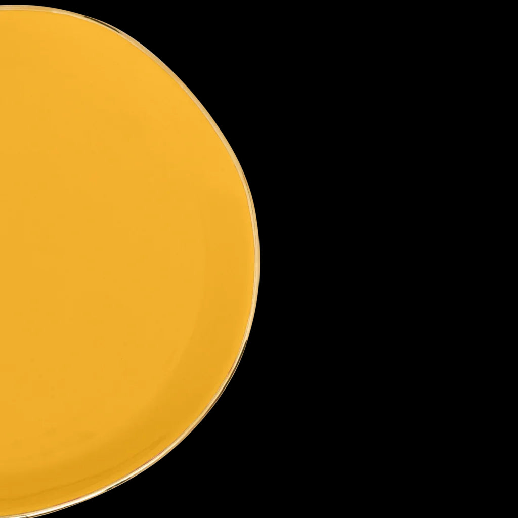 Dit bordje uit onze populaire Good Morning-collectie brengt direct flair aan je ontbijt of gebak dankzij de levendige daglelietint. Het keramische bord is afgewerkt met een met de hand geschilderde gouden rand, wat zorgt voor een verfijnd en speels accent.