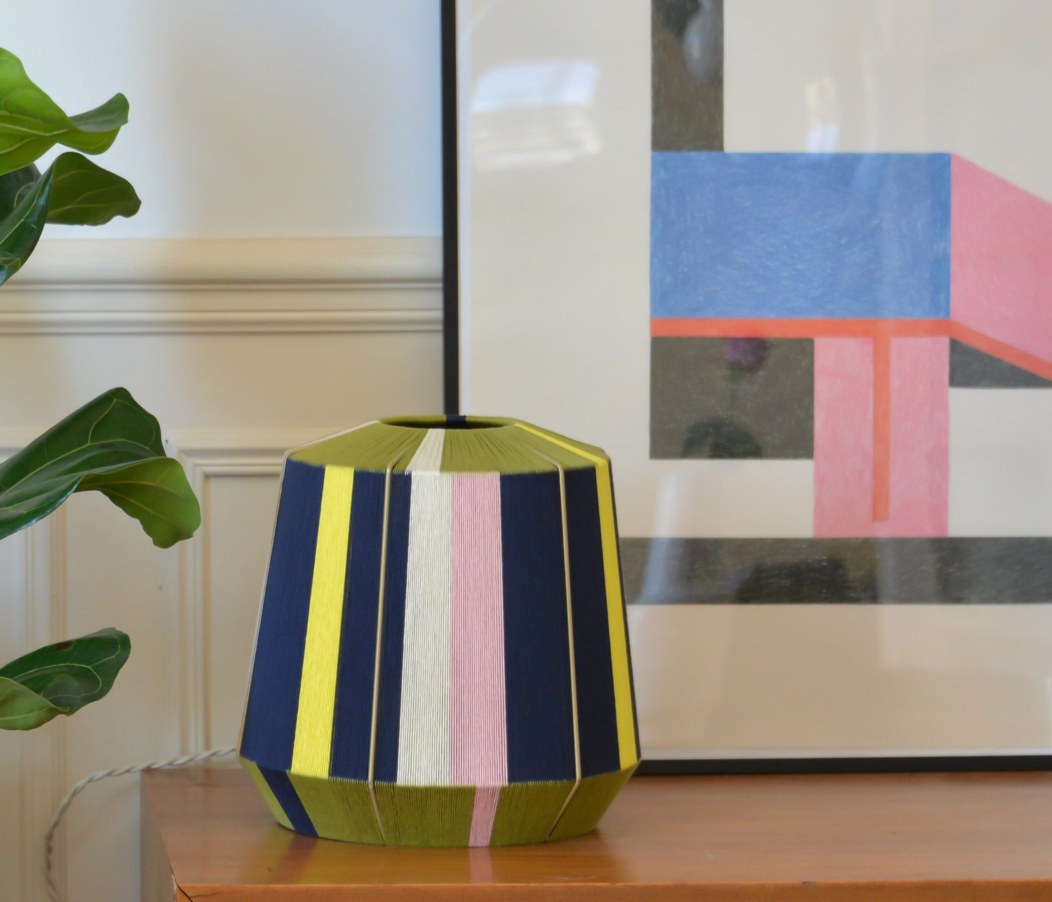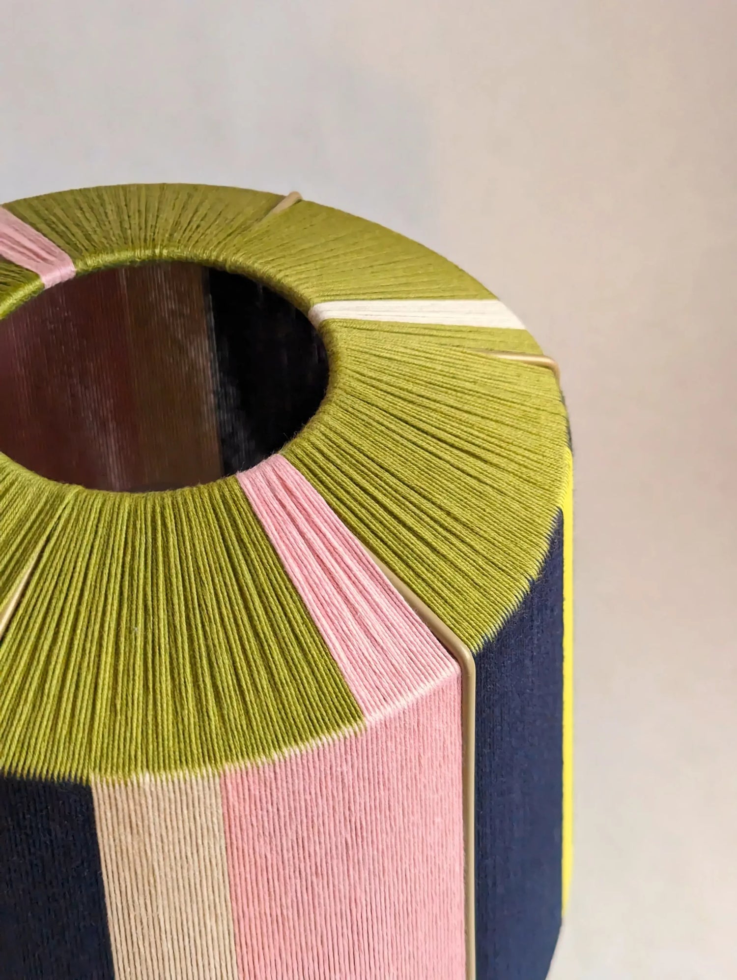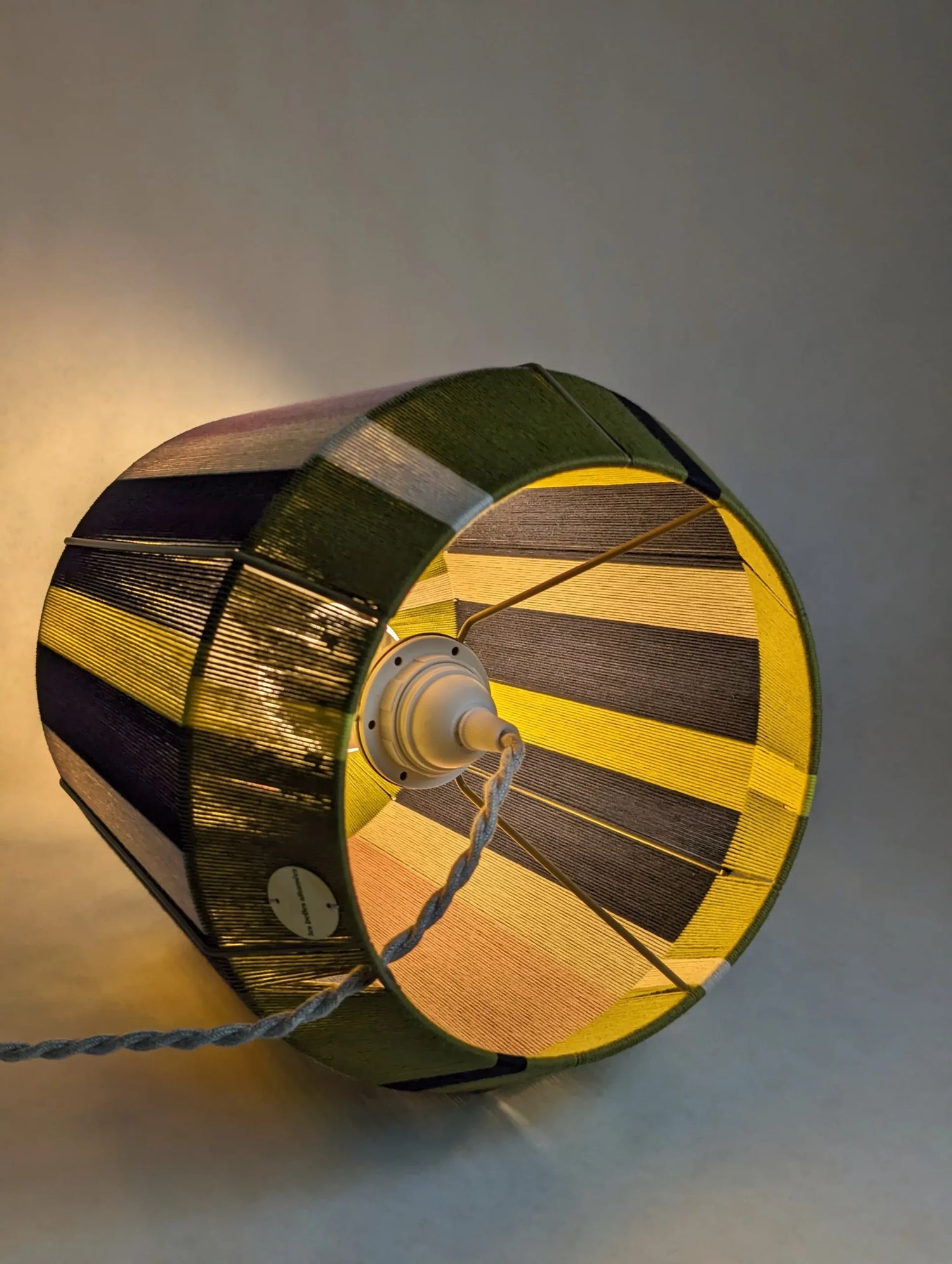L’Epicurienne is een moderne, handgeweven lamp met een grafische mandvorm die onmiddellijk sfeer en karakter toevoegt aan elke ruimte. De kleurencombinatie marine, olive, poudré en jaune zorgt voor een warme, artisanale en verfijnde uitstraling.