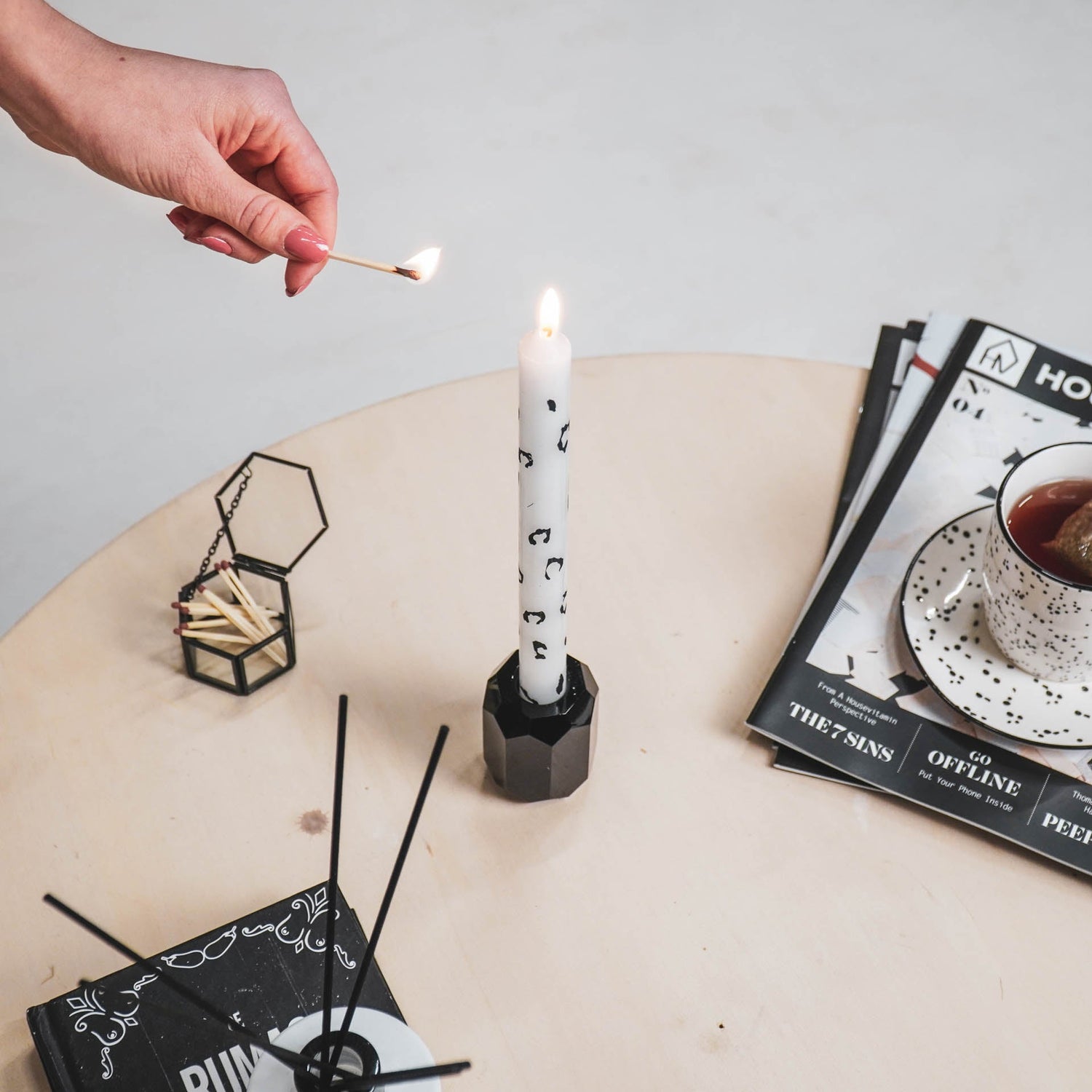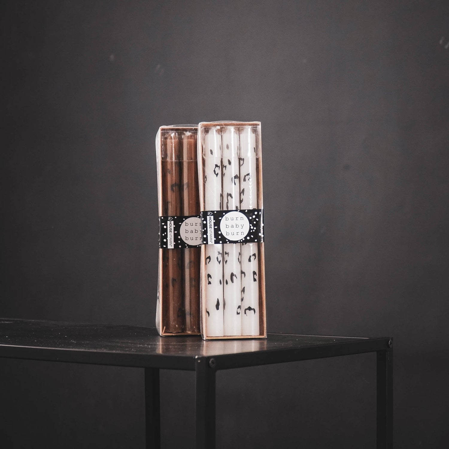 BURN BABY BURN! Deze sfeervolle dinerkaarsen van Housevitamin zijn gemaakt voor romantiek en warmte. Het subtiele panterdesign geeft een speelse twist, terwijl de witte kleur zorgt voor een frisse en stijlvolle uitstraling. Perfect voor volwassen interieurs die houden van karakter met balans.