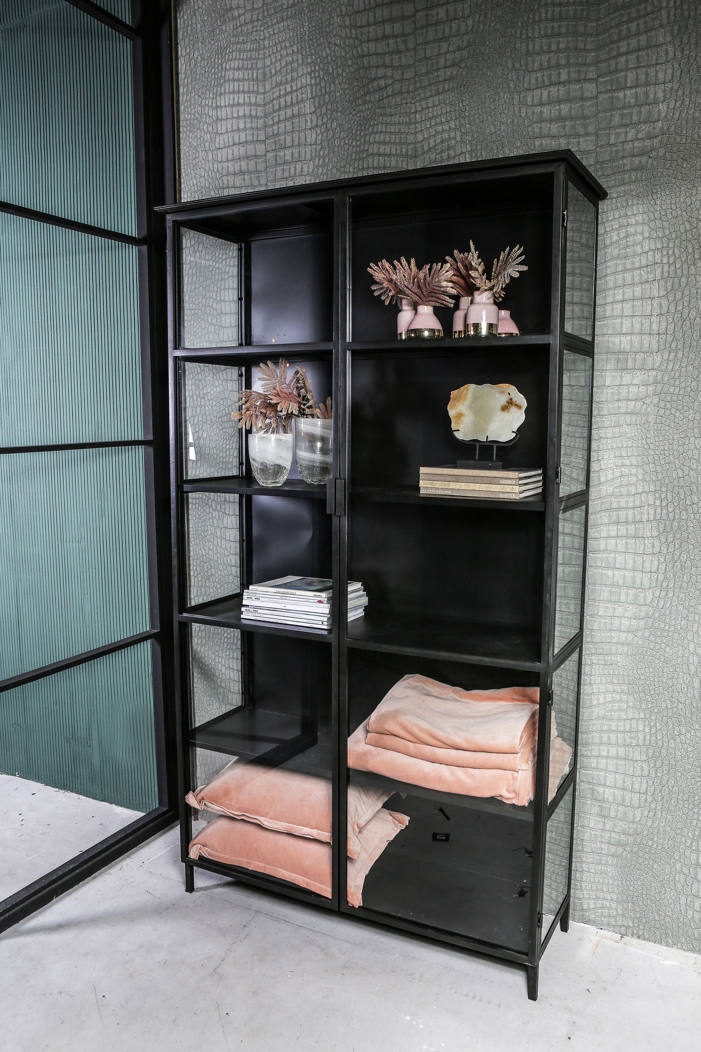 Materiaal | Zwart gepoedercoat ijzer met volledig glazen deuren en glazen zijpanelen