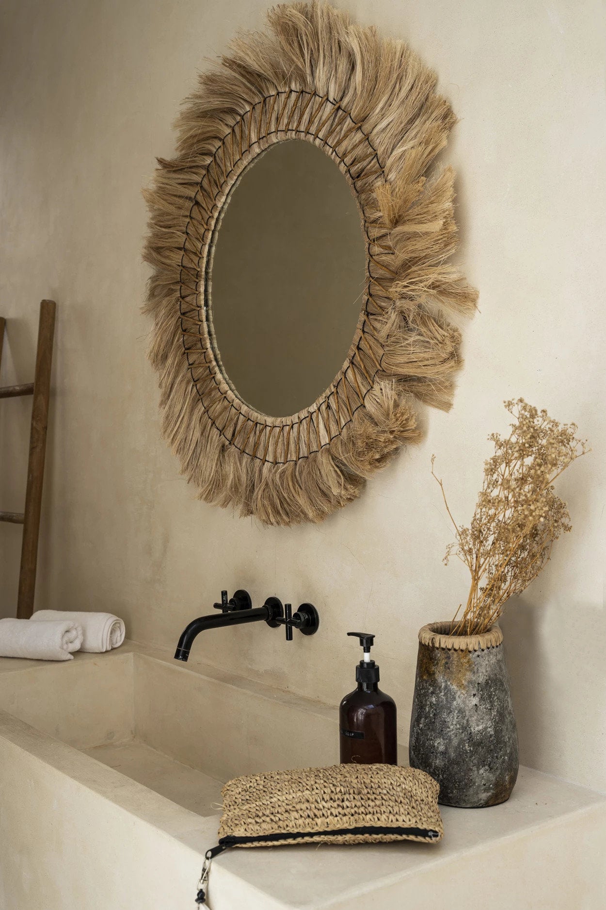 Het handgemaakte terracotta is afgewerkt met een prachtige antique grey textuur, gecombineerd met een raffia detail dat meteen een warme boho-coastal uitstraling geeft. De organische imperfecties maken elke vaas uniek.