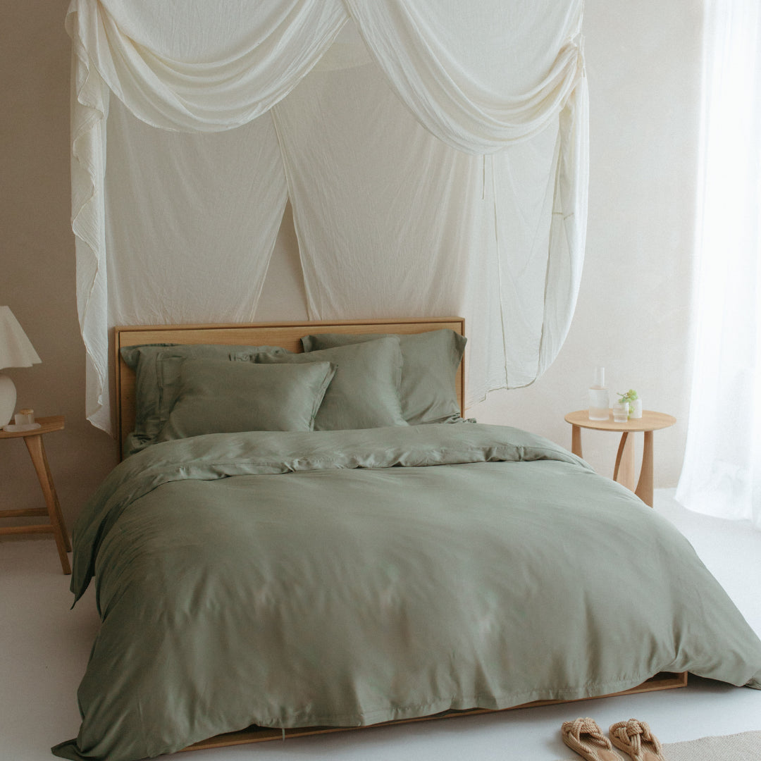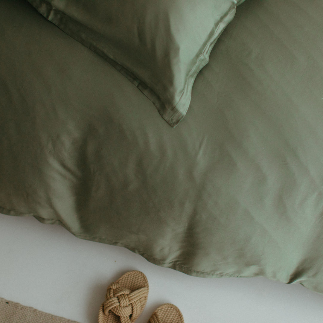 De natuurlijke bamboevezel neemt tot 40% meer vocht op dan katoen en voelt fris en clean aan, alsof het net van de waslijn komt. De diepe olijfgroene kleur geeft de slaapkamer een rustige, natuurlijke uitstraling met een warme, stijlvolle touch.