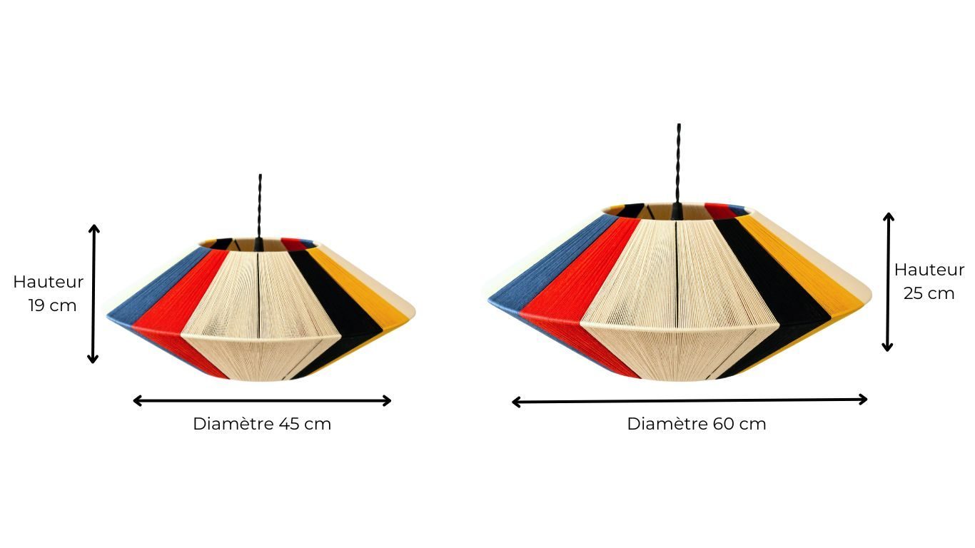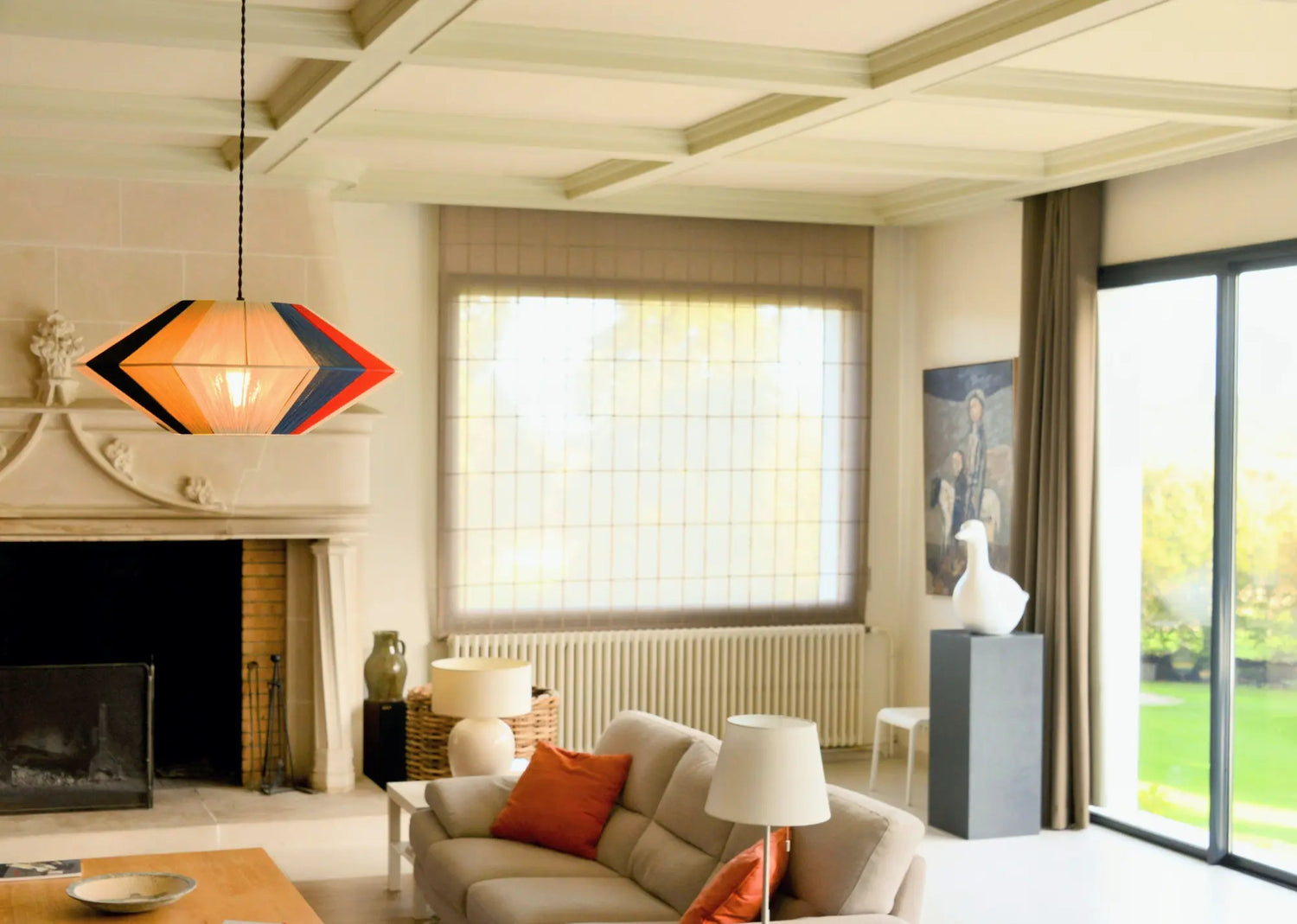 De lamp is handgeweven in de iconische Primaire-kleuren: room, nachtblauw, passie, saffraan en zwart - die samen een artistiek en krachtig kleurbeeld vormen.