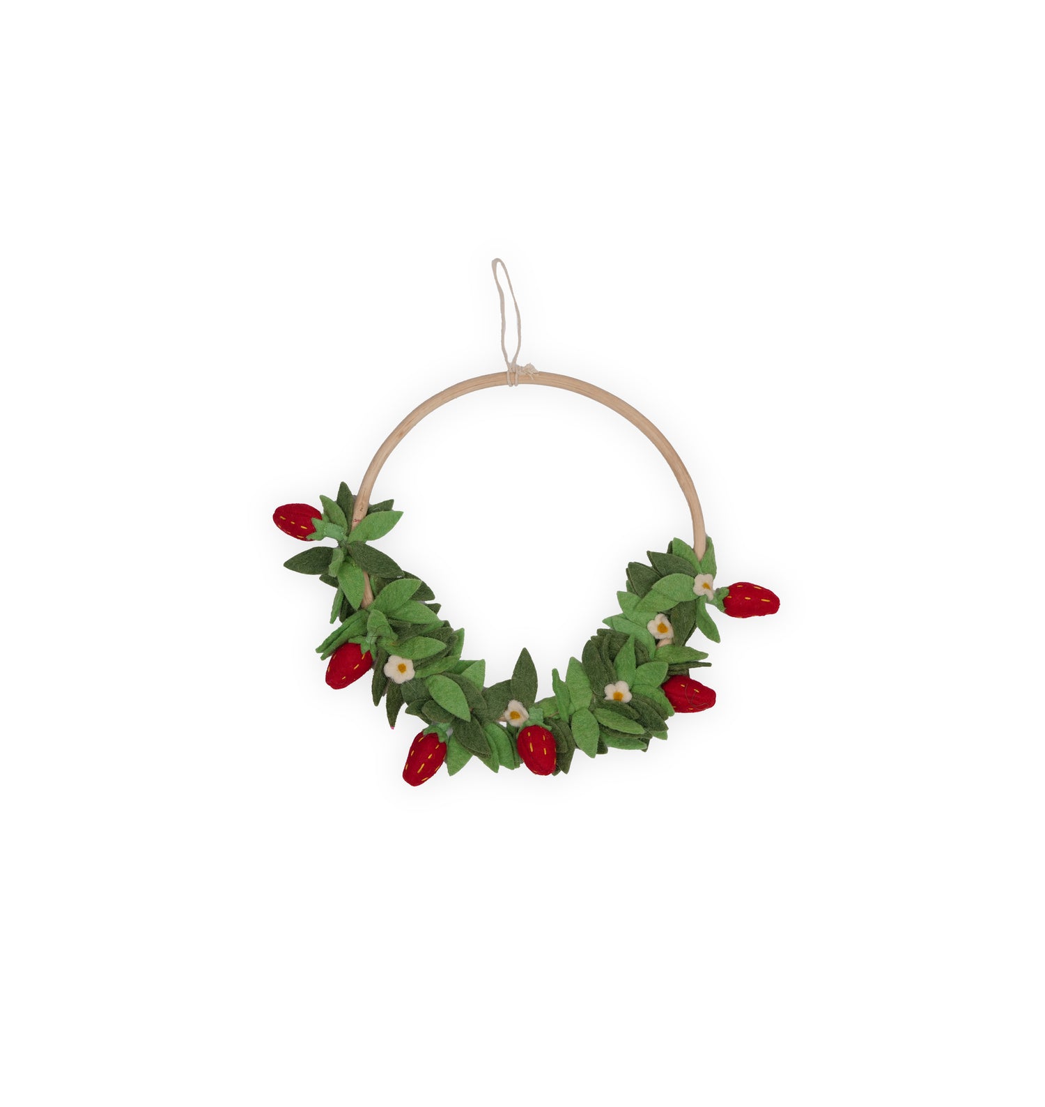 Breng een vleugje zomer in huis met de KidsDepot Flower Hoop Strawberry! Deze vrolijke wanddecoratie is handgemaakt van zacht vilt en hout en versierd met vilten aardbeien in frisse rode tinten.